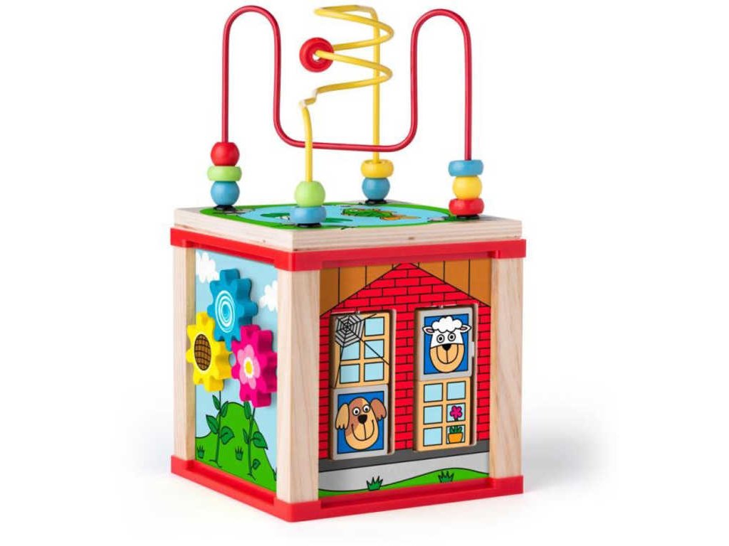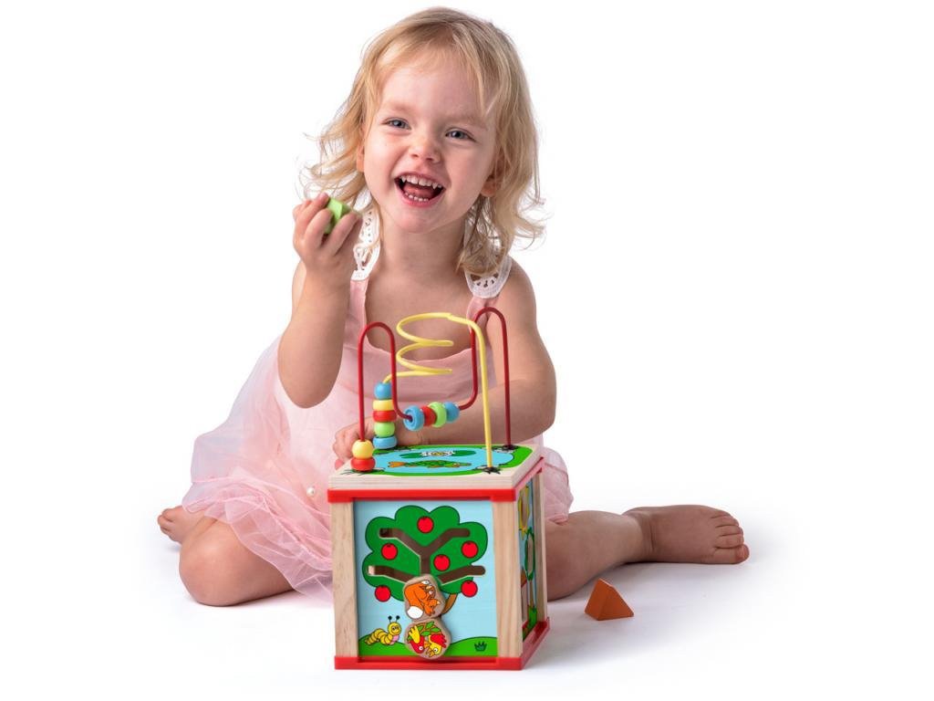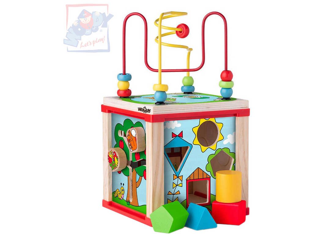 WOODY DŘEVO Baby kostka didaktická vkládačka s labyrintem a aktivitami pro miminko