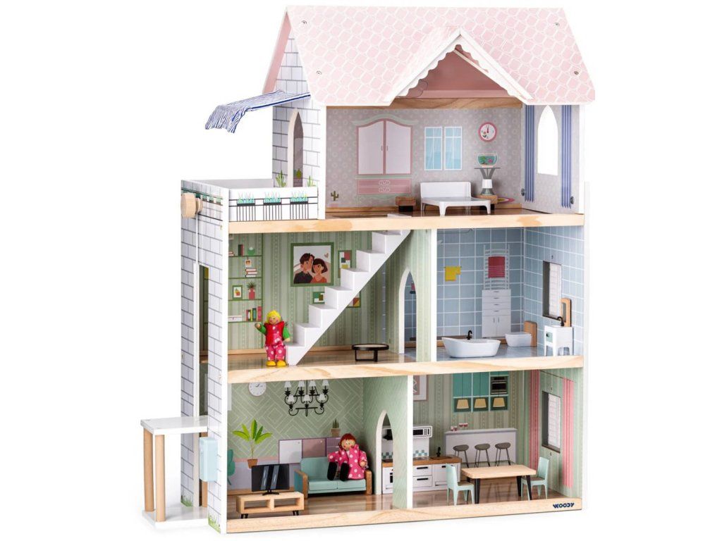 Woody dřevěný třípatrový domek Molly pro panenky. Součástí 2 panenky, nábytek a vybavení, celkem 17ks. Hračka na baterie, se světlem a zvukem.