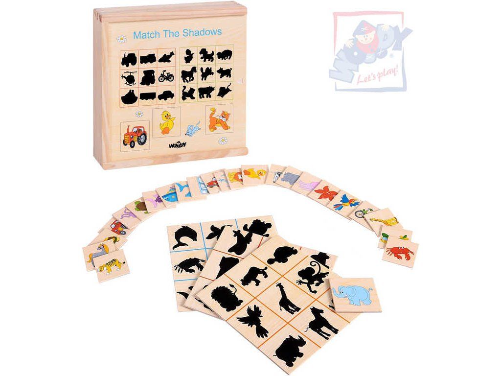 Dětská dřevěná doplňovačka obrázků na políčko s jejich stínem ze dřeva, vhodné pro nejmenší děti.Dítě přiřazuje destičky s barevnými obrázky k jejich černým siluetám. Vše je zabaleno v praktické dřevěné krabičce. Stínové puzzle "přiřaď, co kam patří".