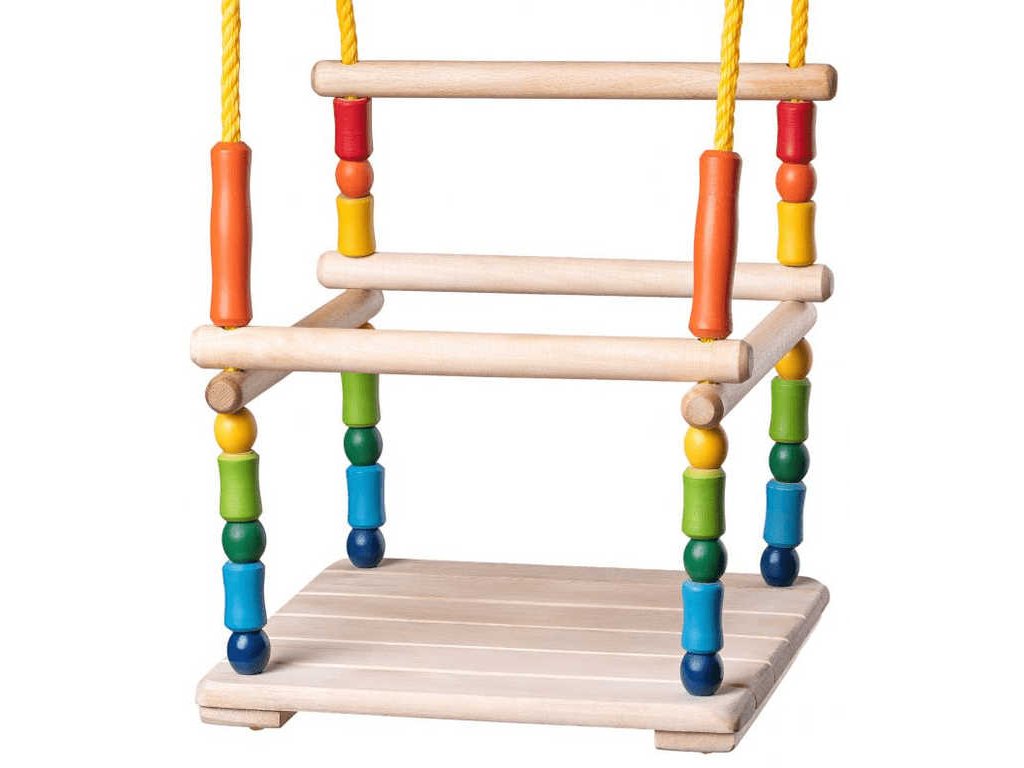 Tato houpačka pro nejmenší děti je vyrobena z masivního dřeva. Je opatřena bezpečnostní ohrádkou. Zvednutím přední tyčky ohrádky se dítě snadno dostane dovnitř i ven. Houpačka má
