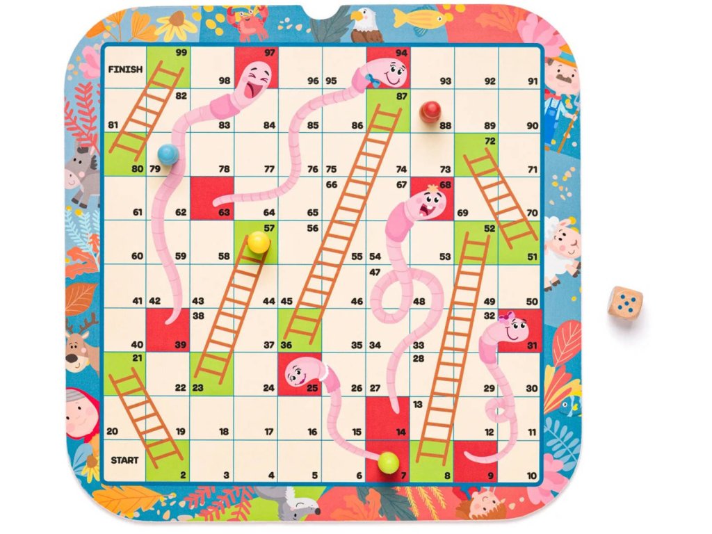 HADI A ŽEBŘÍKY - Zúčastněte se závodu s neočekávanými zvraty. Na své cestě se setkáte s políčky, která vás vzdálí od vašeho cíle, nebo vás naopak přiblíží k výhře. Kdo zvítězí?