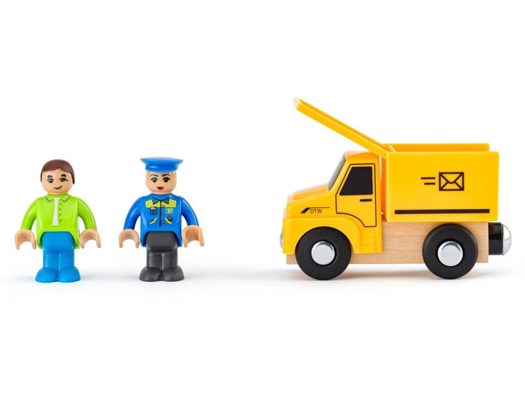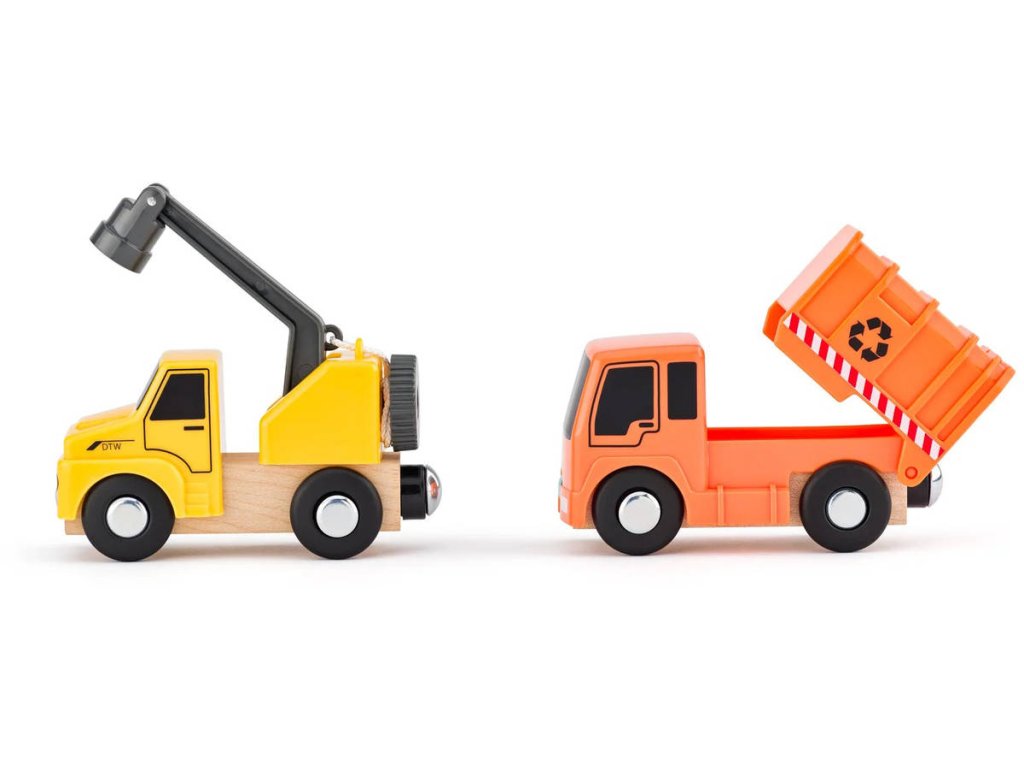 WOODY 90798 Příslušenství k vláčkodráze, sada užitkových vozidel (pošta, popeláři, jeřáb, nákladní auto) + plastové doplňky a 2 figurky s pohyblivými klouby.