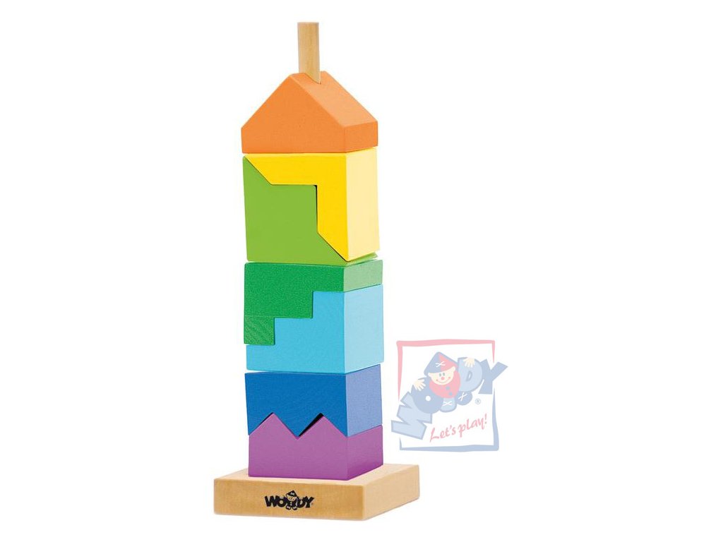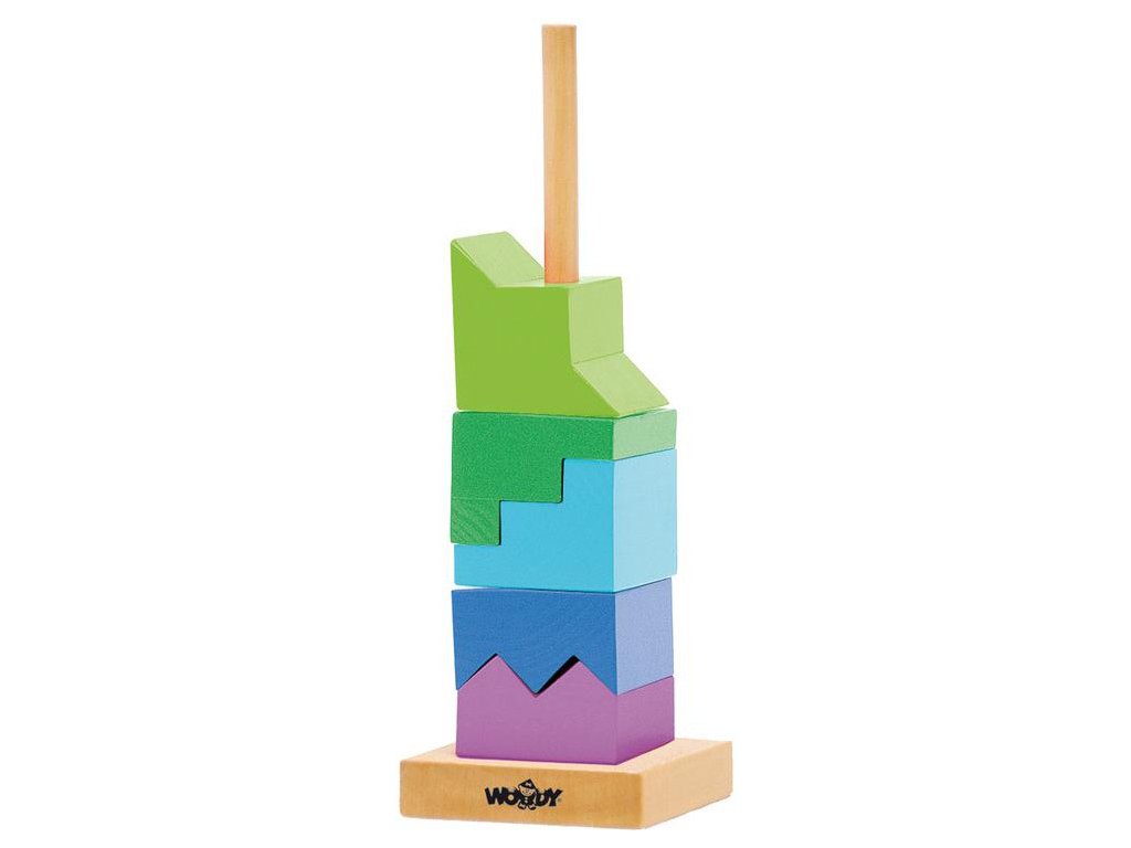 Skládanka z dřevěných kostiček nabídne zábavné chvíle každému dítěti. Z této povedené skládanky lze postavit veselou barevnou věž. Obsahuje podstavec s jednou tyčkou, na něž se kostičky navlékají. Tato činnost dítě nejenom zabaví, ale bude mít příznivý vliv na rozvoj jeho motorických schopností, logického uvažování a představivosti.