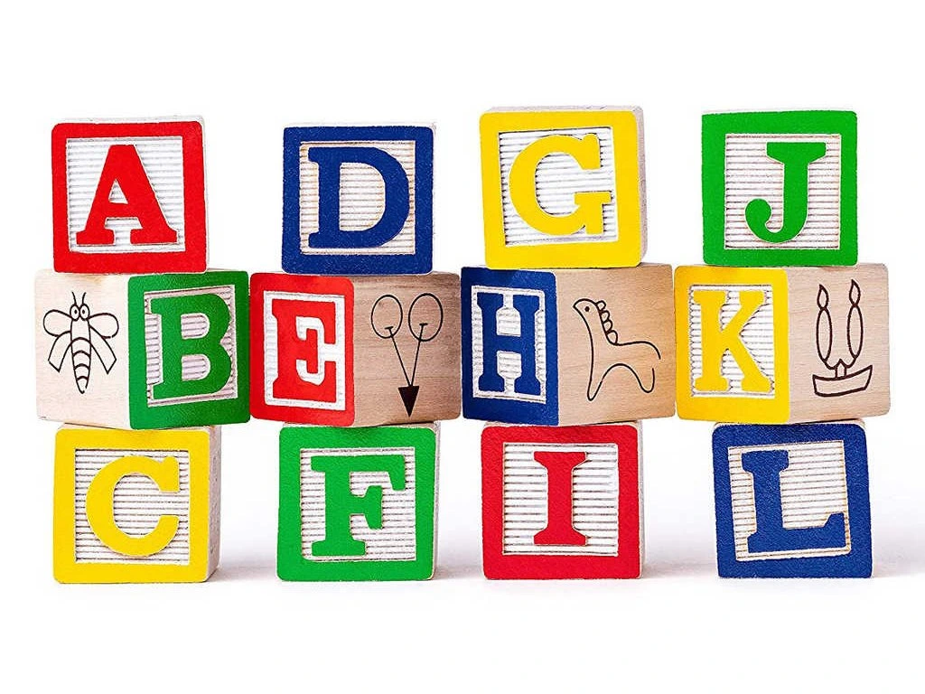 Sada 35ks dřevěných kostiček umístěných v dřevěném vozíku. 12 z nich je ze dvou stran v plastickém a barevném provední písmen tak, aby mohly sloužit i jako razítko. Ostatní kostky jsou v