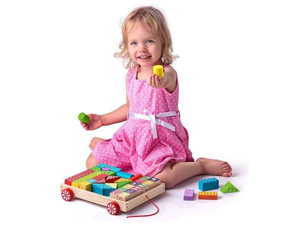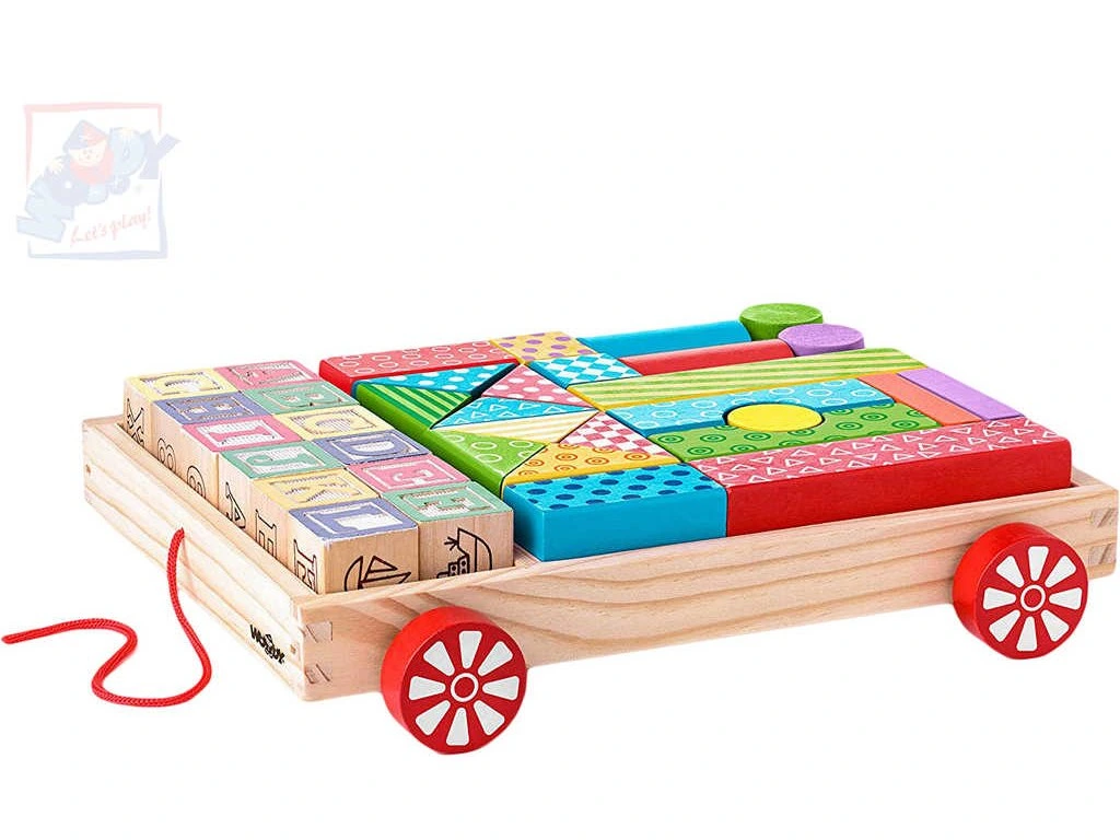 WOODY DŘEVO Vozík tahací stavebnice s kostkami a razítky set 35ks