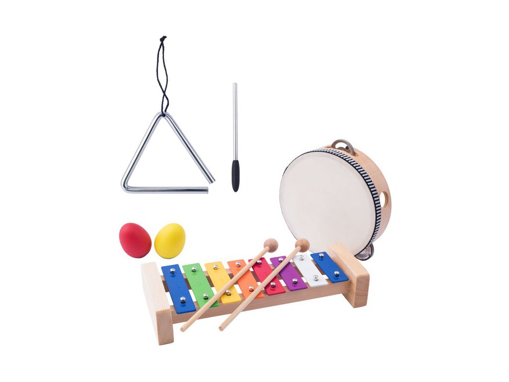 Obsah balení: tamburina, triangl s paličkou, xylofon se 2 paličkami, kastaněty (vajíčko 2ks)