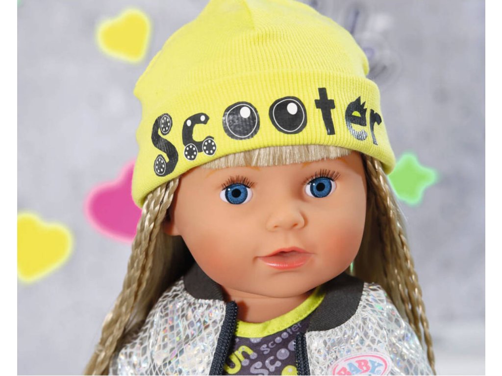 Do města BABY born vyráží na skútru. Aby jí přilba nezničila účes, nasadí si pod ni ještě žlutou čepici. Jako ochranu proti větru nosí bundu s lesklým stříbrným vzorem. Kontrastní manžety a zip dokonale ladí s písmenkovým potiskem na šatech.