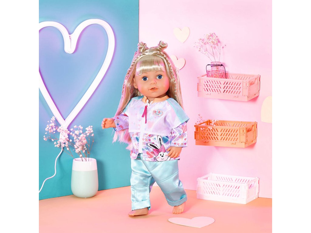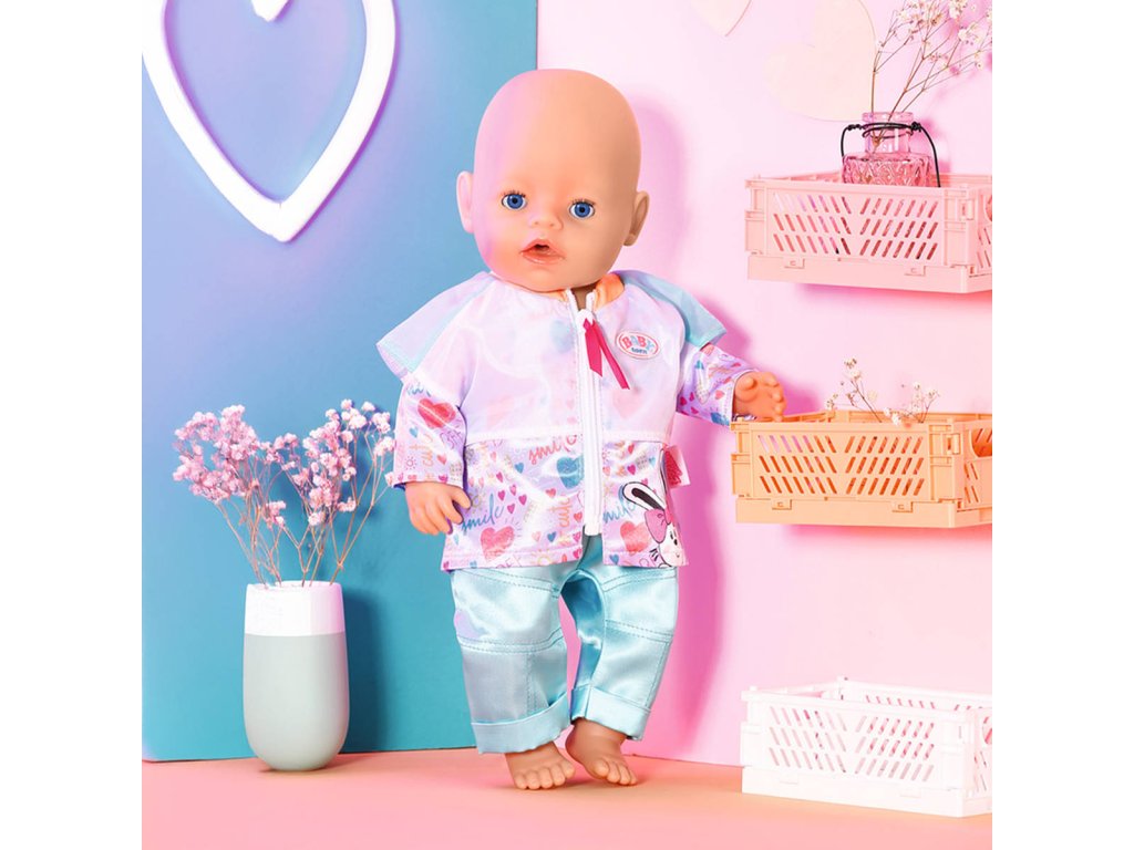 Někdy, když ráno odcházíme z domu, ještě nevíme, co nám daný den přinese. Je tak potřeba mít oblečení, které se bude hodit pro každou aktivitu. Mělo by být sportovní a zároveň nápadité. Pro takové dny má panenka BABY born připravenu pohodlnou bundu ve světle fialové barvě. Část je potištěna barevnými kresbami. Zlatým hřebem outfitu je průhledný svrchní pláštík. K tomu si malá parádnice oblékne lesklé kalhoty v akvamarínové barvě. Švy na kalhotách vypadají skoro jako dlaždičky v bazénu.