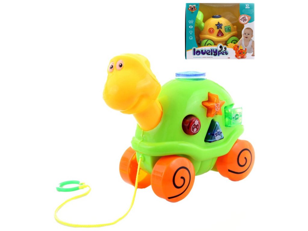Tahací veselá želvička na kolečkách, o velikosti 15cm, pro nejmenší děti. Želva hraje melodie a zvuky zvířátek. Hračka na baterie, se světlem a zvukem. 2 barevné varianty.